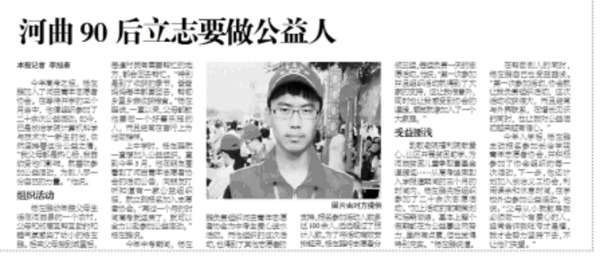 《山西青年报》2015年11月18日07版以《河曲90后立志要做公益人》为题,报道了我院计算机系计科1501班学生杨左鹏参加志愿活动和公益活动的事迹。近日,该报道已被人民网人民微博(http://t.people.com.cn/indexV3.action)、山西新闻网忻州频道、河曲在线 (www.hequ.ccoo.cn/)等媒体转载。