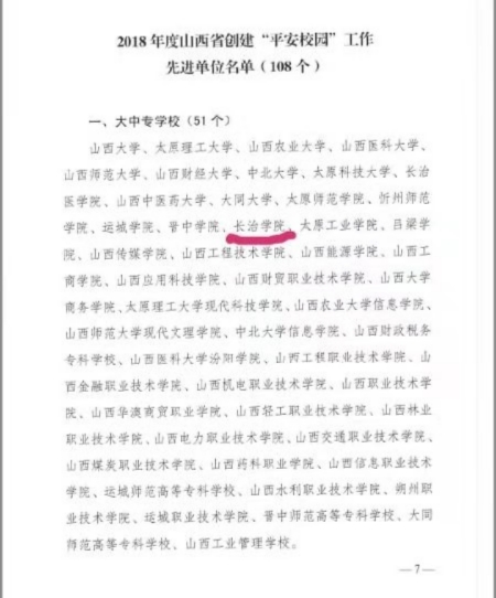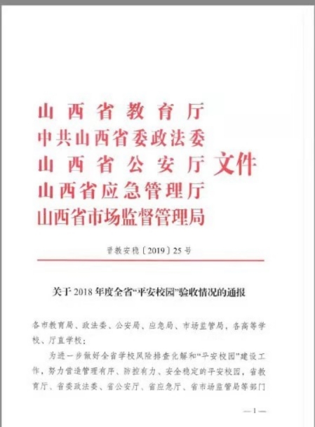 近日,省政法委、省教育厅、省公安厅、省应急管理厅、省市场监督管理局联合发文(晋教安稳〔2019〕25号)通报2018年度山西省创建“平安校园”工作先进单位,beat365在线唯一官网榜上有名。