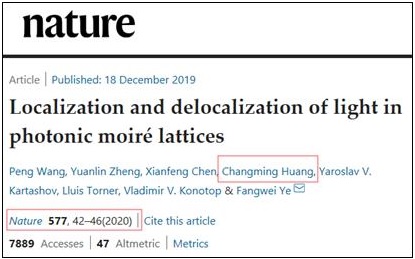 1月2日,我院电子信息与物理系黄长明博士在国际顶尖学术期刊自然杂志《Nature》以研究论文(Article)形式正式发表了题为《Localization and delocalization of light in photonic moirélattices》的论文。我院为第三合作单位,这是我院教师首次在自然杂志发表论文,填补了我院在该杂志发表学术论文的空白。黄长明博士的科研成果是我院科学研究取得的重大突破,标志着我院在国际顶尖学术期刊拥有了一席之地。目前,山西高校中也仅有屈指可数的几位专家在该杂志发表论文,新建本科院校教师发表论文尚属首次。
