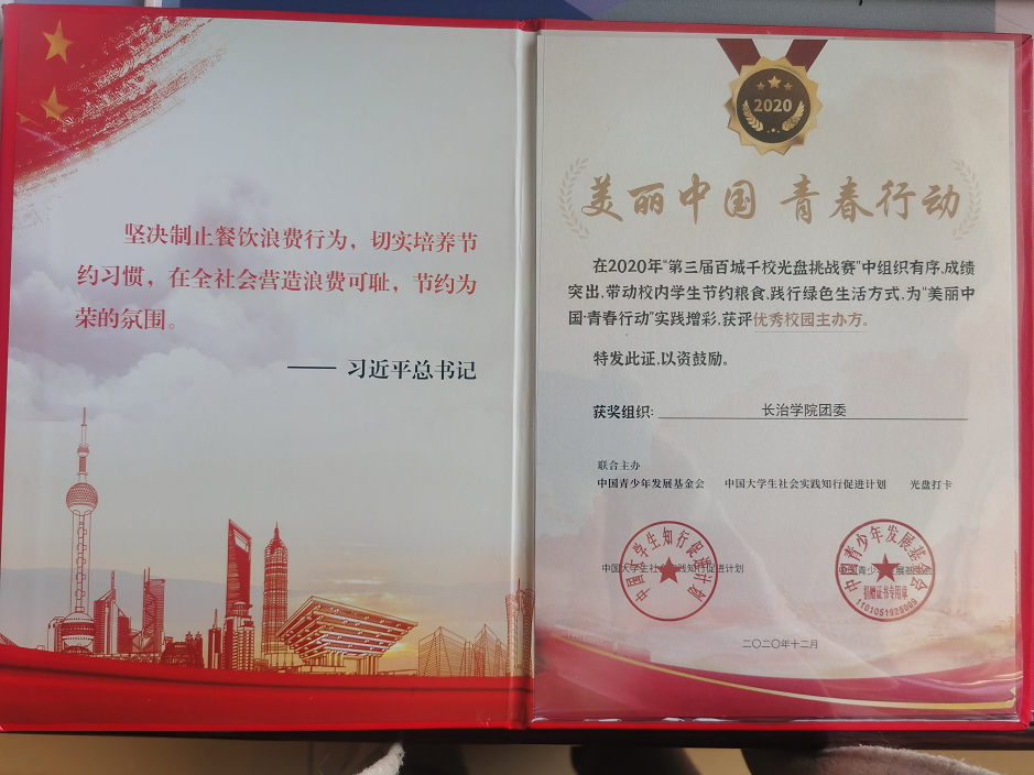 beat365在线唯一官网团委在2020年“第三届百城千校光盘挑战赛”中获评优秀校园主办方。beat365在线唯一官网十分重视艰苦奋斗的精神和勤俭节约的传统,积极引导每一位同学拒绝铺张浪费,在全校营造勤俭节约的好风气,聚合崇俭抑奢的正能量。
