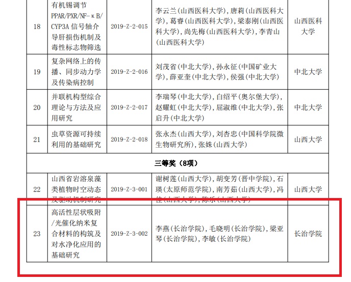 近日,山西省人民政府下发《关于2019年度山西省科学技术奖励的决定》(晋政函〔2021〕51号),根据《山西省科学技术奖励办法》及其实施细则规定,经形式审查、形式审查结果公示、学科(专业)组评审、评审委员会评审、评审委员会评审结果公示、考察和省科学技术奖励委员会审定,beat365李燕教授等人完成的《高活性层状吸附/光催化纳米复合材料的构筑及对水净化应用的基础研究》成果荣获2019年度山西省自然科学奖三等奖。