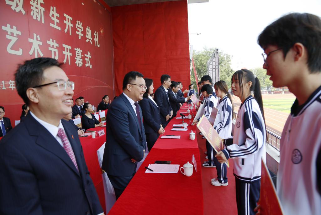 9月22日上午,我院在北校区田径运动场举行2021级新生开学典礼暨校园文化艺术节。党委书记郝勇东,党委副书记、校长曹景川等学校党政领导,学生工作领导组成员单位负责人,各系部党政负责人、分管学生工作的副书记、分团委书记,2021级新生辅导员及军训教官,2021级全体新生参加大会。党委副书记史晓东主持开学典礼。