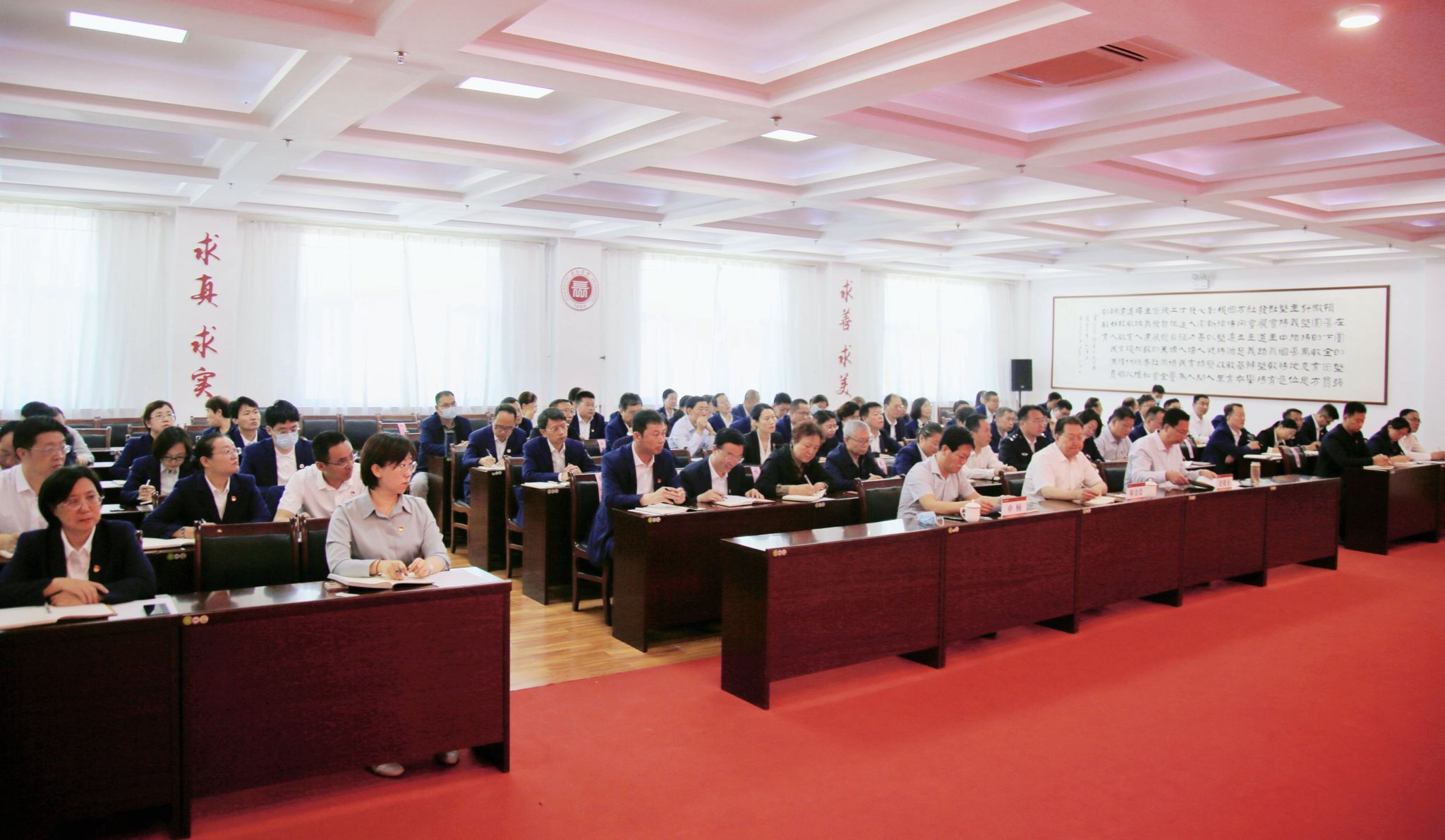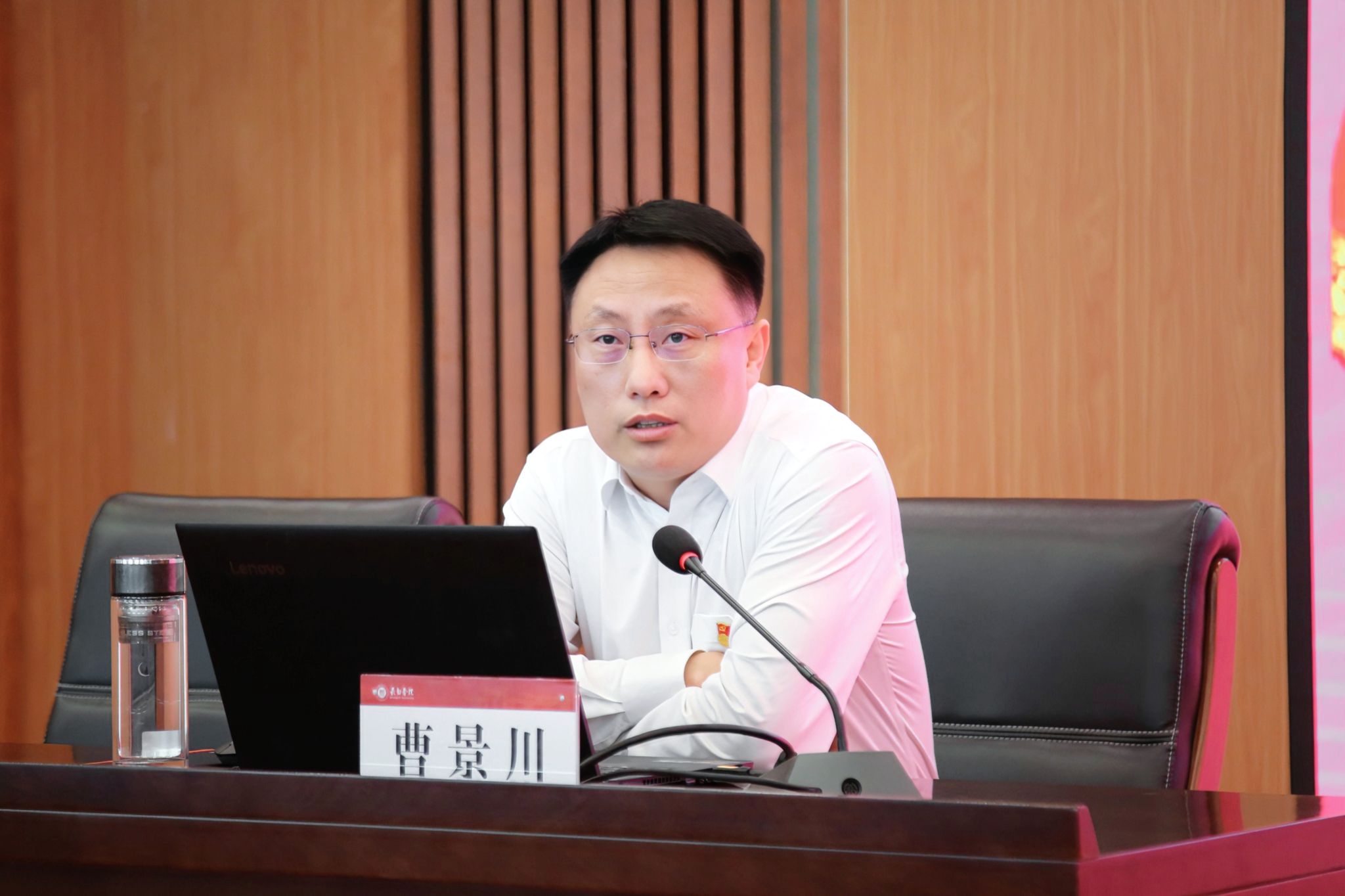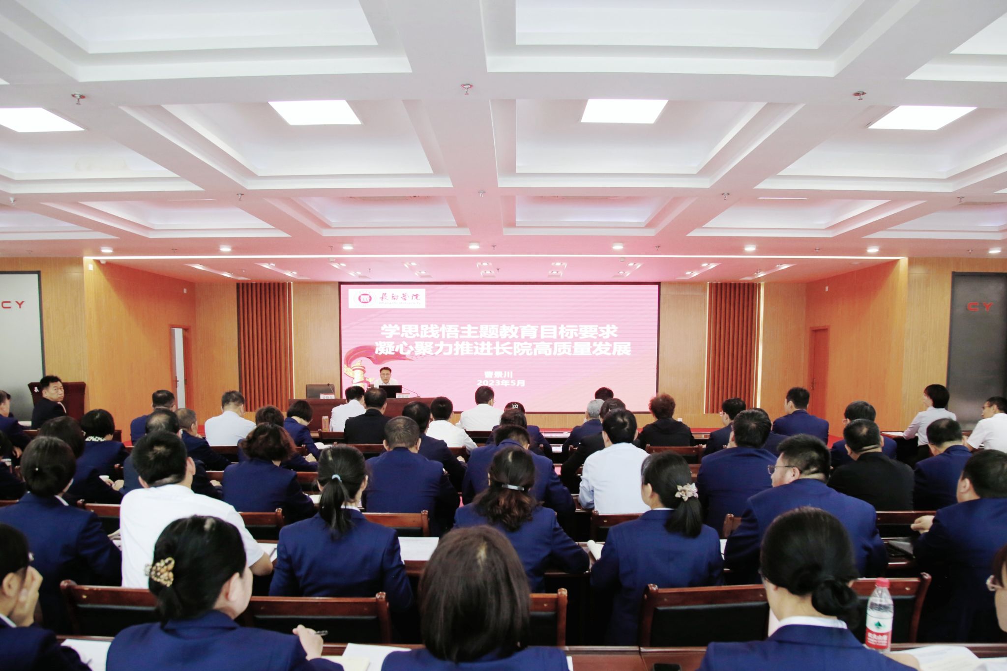 5月24日,校长曹景川以“学思践悟主题教育目标要求 凝心聚力推进长院高质量发展”为题,讲授主题教育专题党课。省委主题教育巡回指导组副组长、太原工业学院党委副书记靳金贵,省委主题教育巡回指导组成员申楠到会指导。校领导、各职能部门负责人,各系党委书记、主任、副主任,校长办公室党支部全体党员参加党课学习。党课由党委副书记史晓东主持。