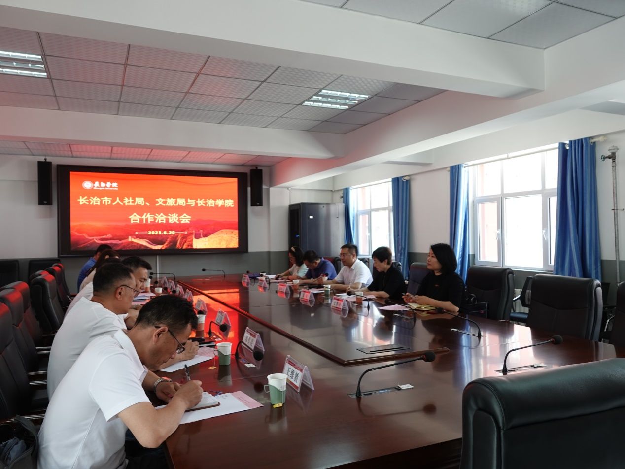 6月20日下午,长治市人力资源与社会保障局党组书记、局长徐晨星,市文化和旅游局党组书记、局长张琼一行来beat365就长治市旅游人才培训培养进行合作洽谈。校党委委员、副校长卫崇文以及历史与旅游管理系党政负责人参加。