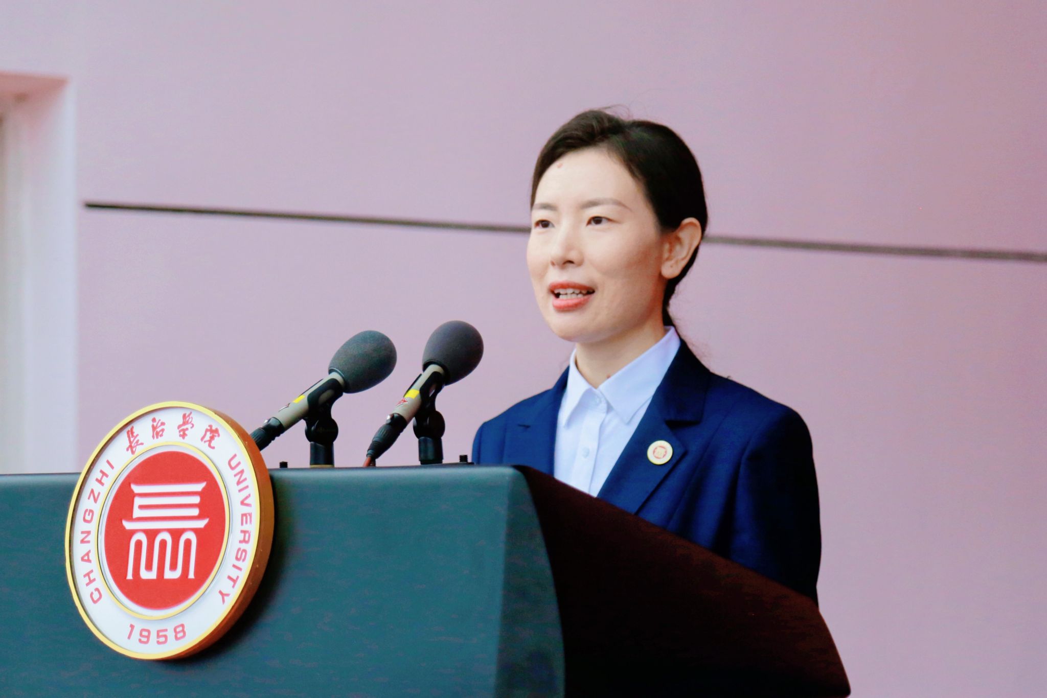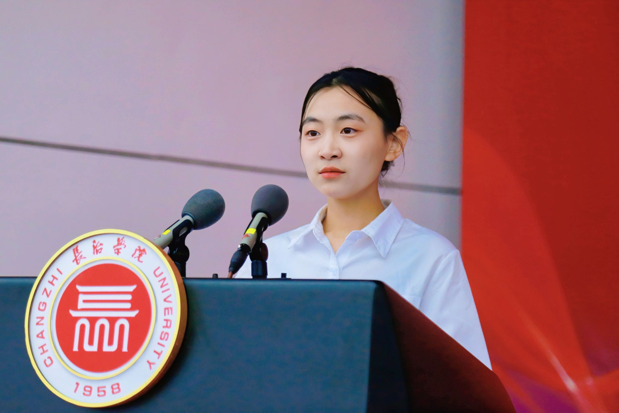 音乐舞蹈系航管2302班褚丽飞作为新生代表发言。她表示,作为新长院人,将把“求真、求实、求善、求美”的校训内化于心、外化于行,努力成长为德智体美劳全面发展的时代新人,为学校高发展贡献青春力量。