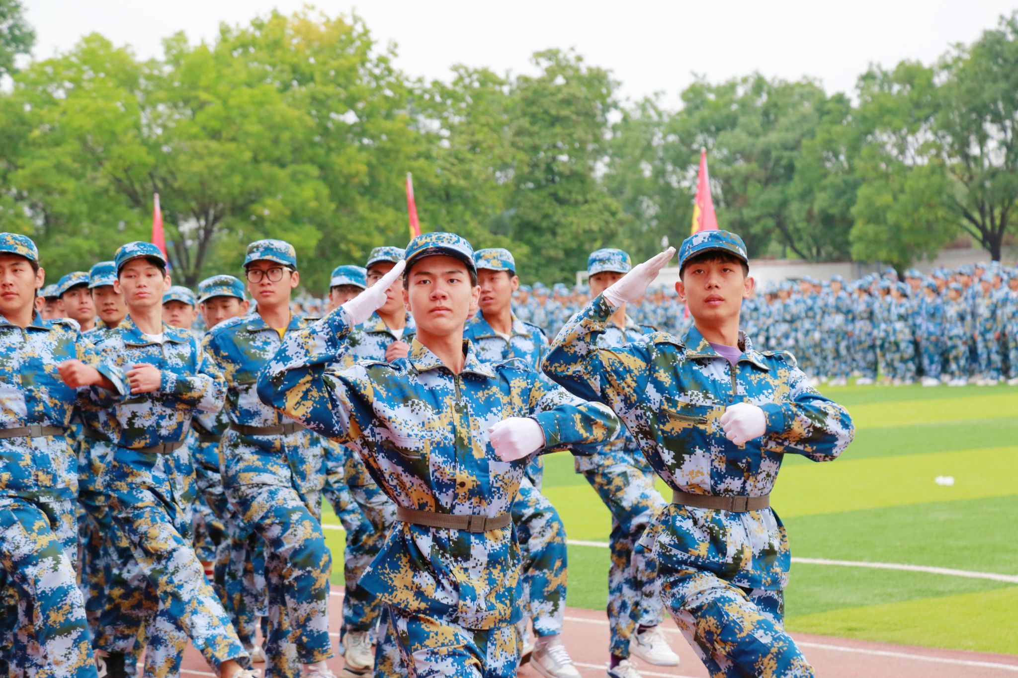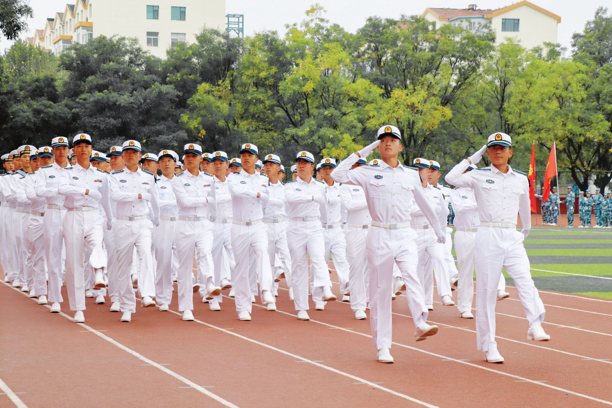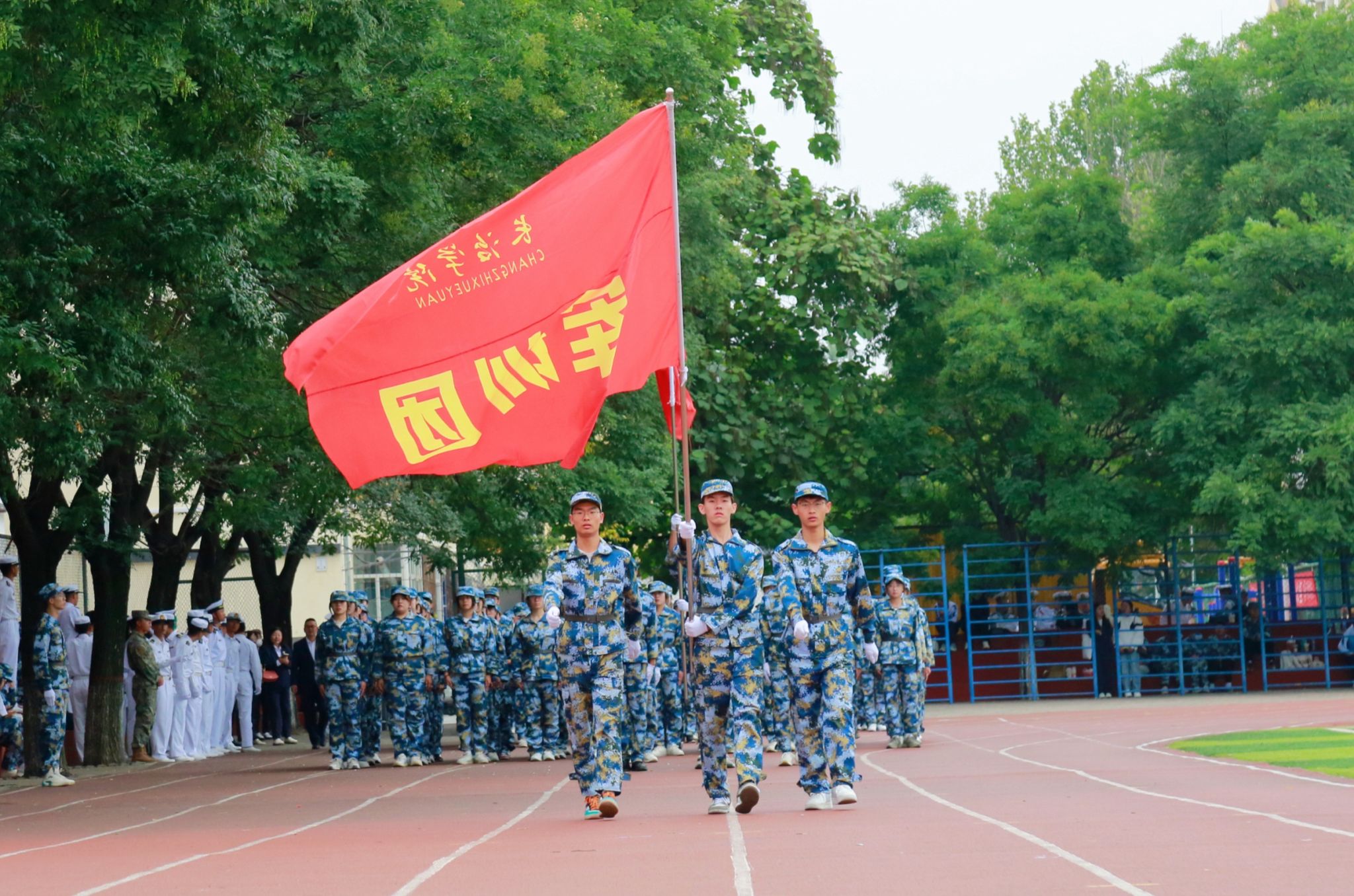 庄严的升旗仪式后,郝勇东在阅兵总指挥刘庆顶等同志的陪同下检阅了学生受训队伍。
