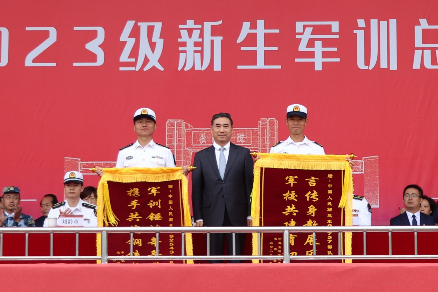 郝勇东向承训本次军训的92727部队和92543部队赠送锦旗。