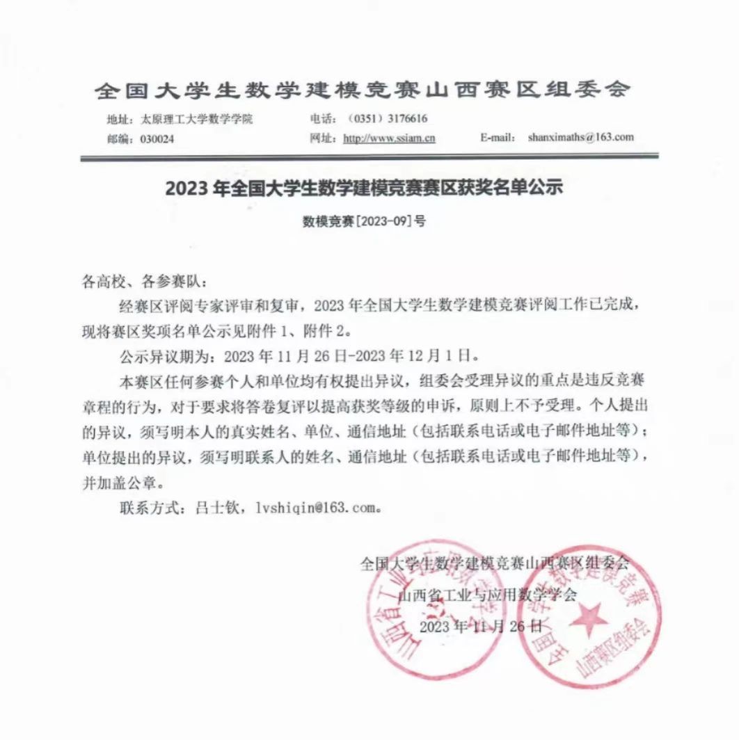 近日,2023年全国大学生数学建模竞赛结果公示,beat365学子荣获山西赛区一等奖4组,二等奖8组,三等奖33组,其中数学系获一等奖4组、二等奖6组、三等奖24组,物理系获二等奖1组、三等奖8组,计算机系获二等奖1组、三等奖1组。