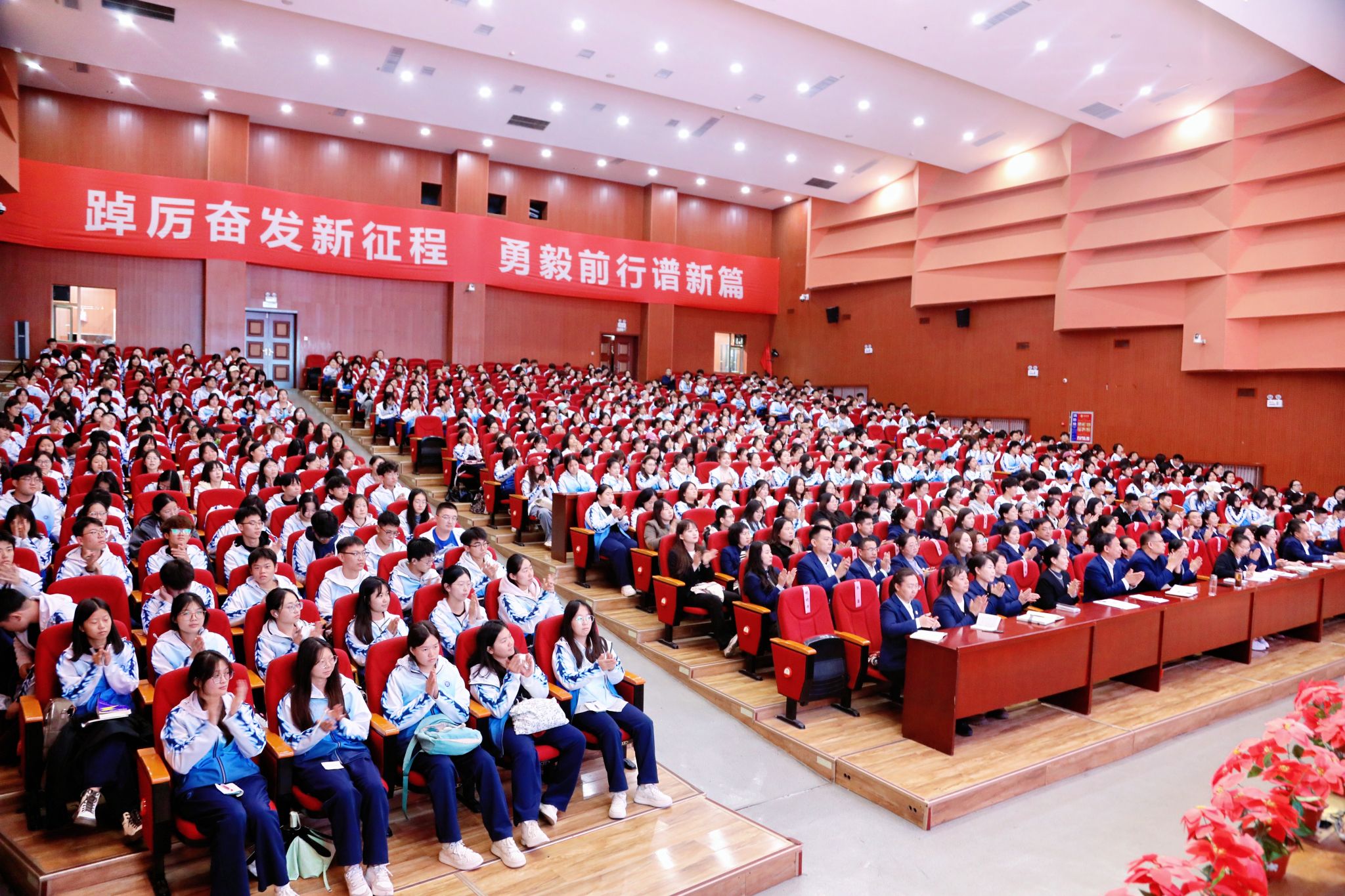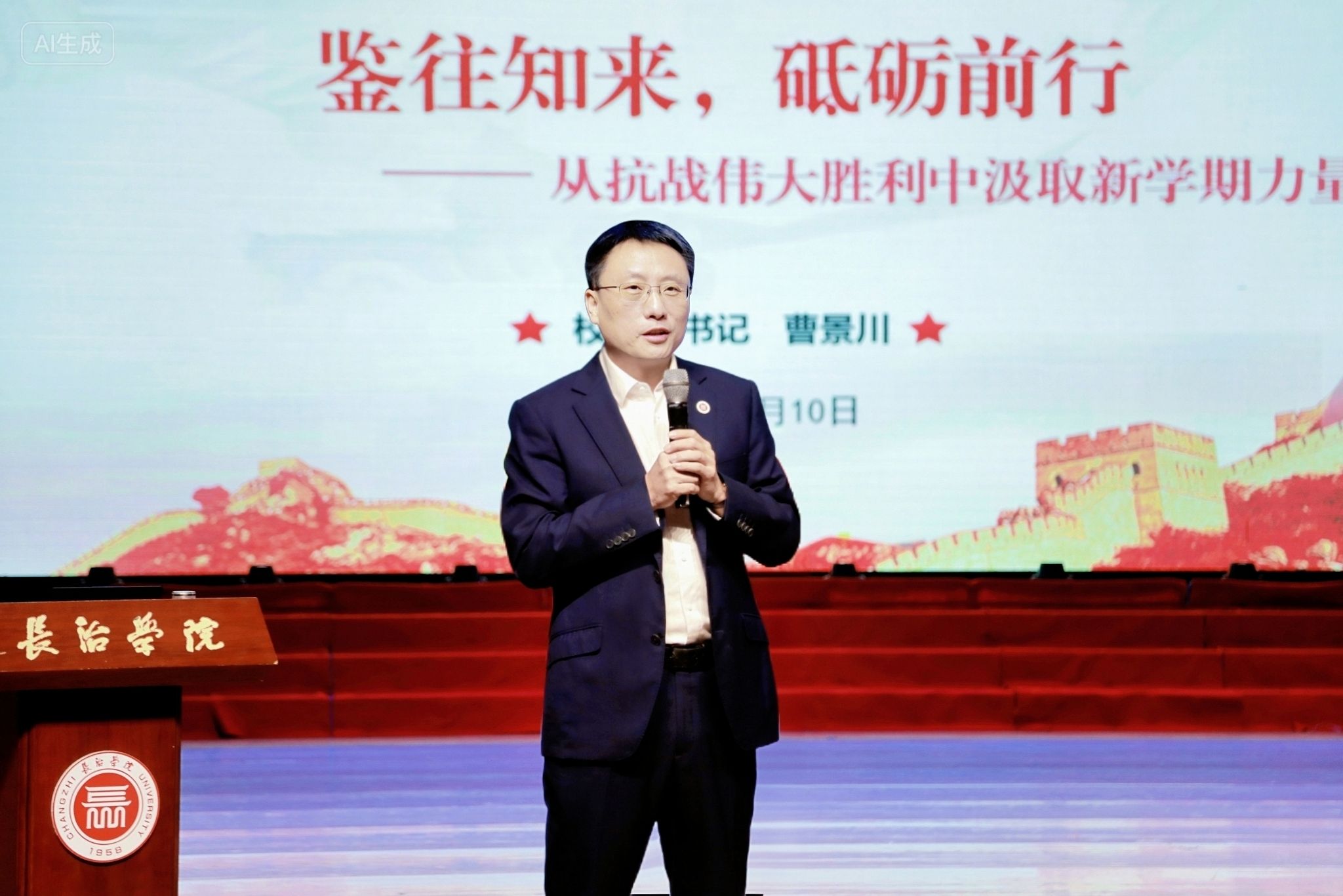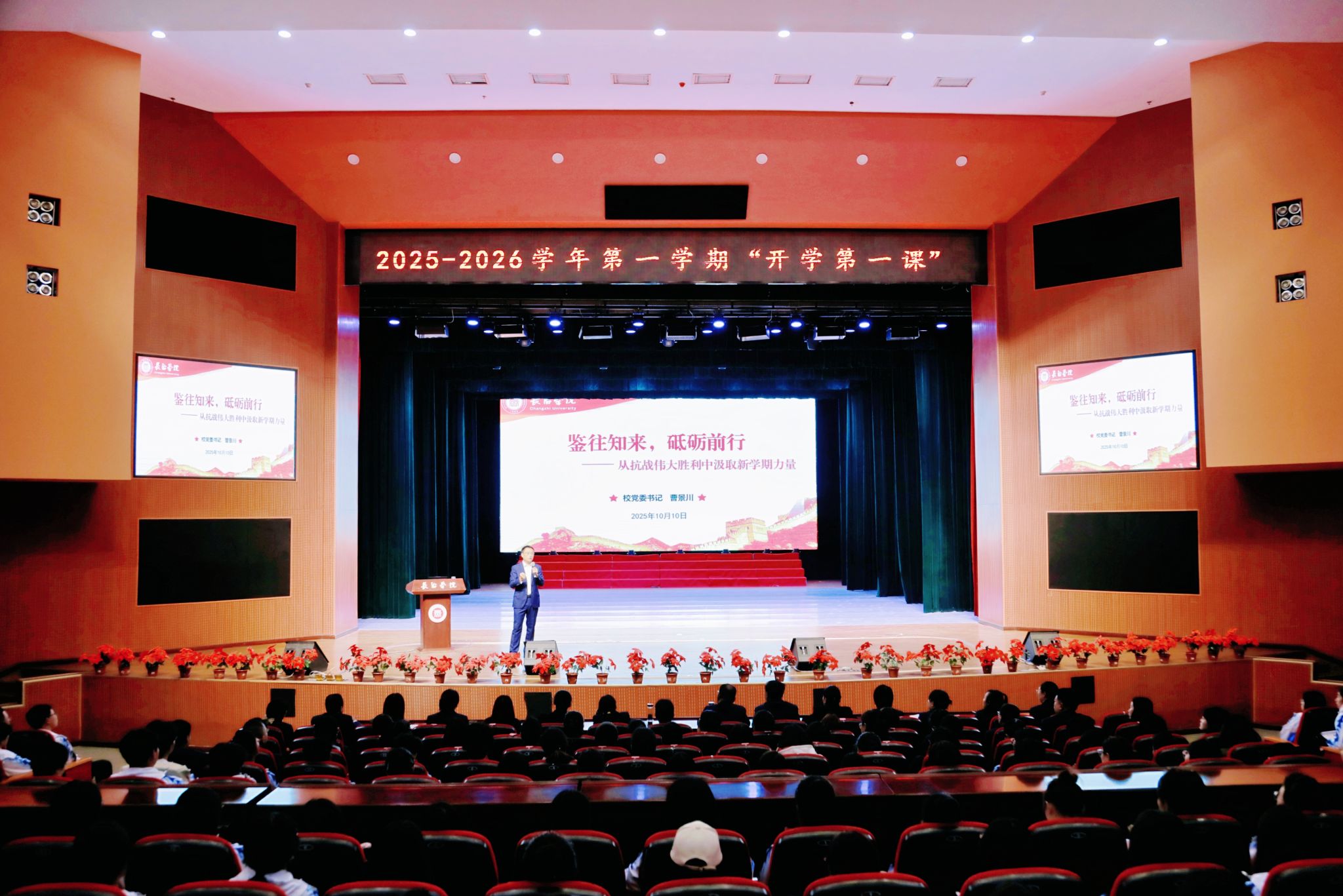 10月10日下午,校党委书记曹景川在实验剧场以“鉴往知来,砥砺前行——从抗战伟大胜利中汲取新学期力量”为主题,为2025级新生讲授“开学第一课”,勉励同学们传承弘扬伟大抗战精神,做新时代有志、有才、有德、有为青年。各院系党委副书记、团委书记、马克思主义学院教师代表、全体辅导员和学生代表等500余名师生参加。