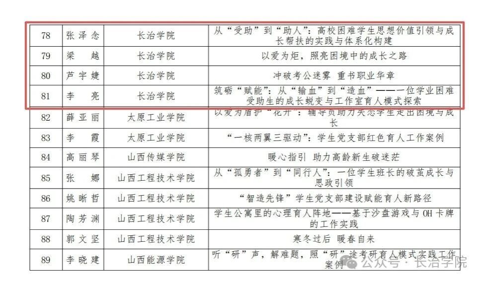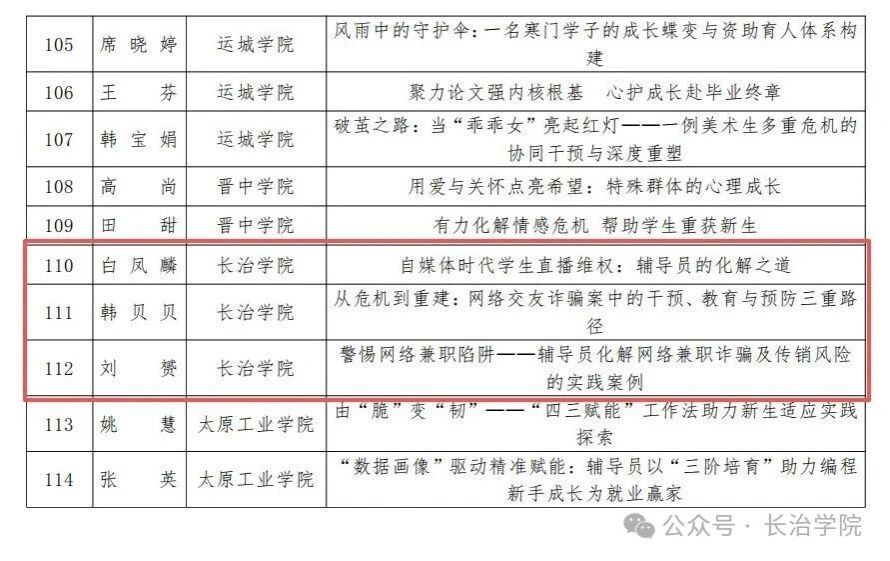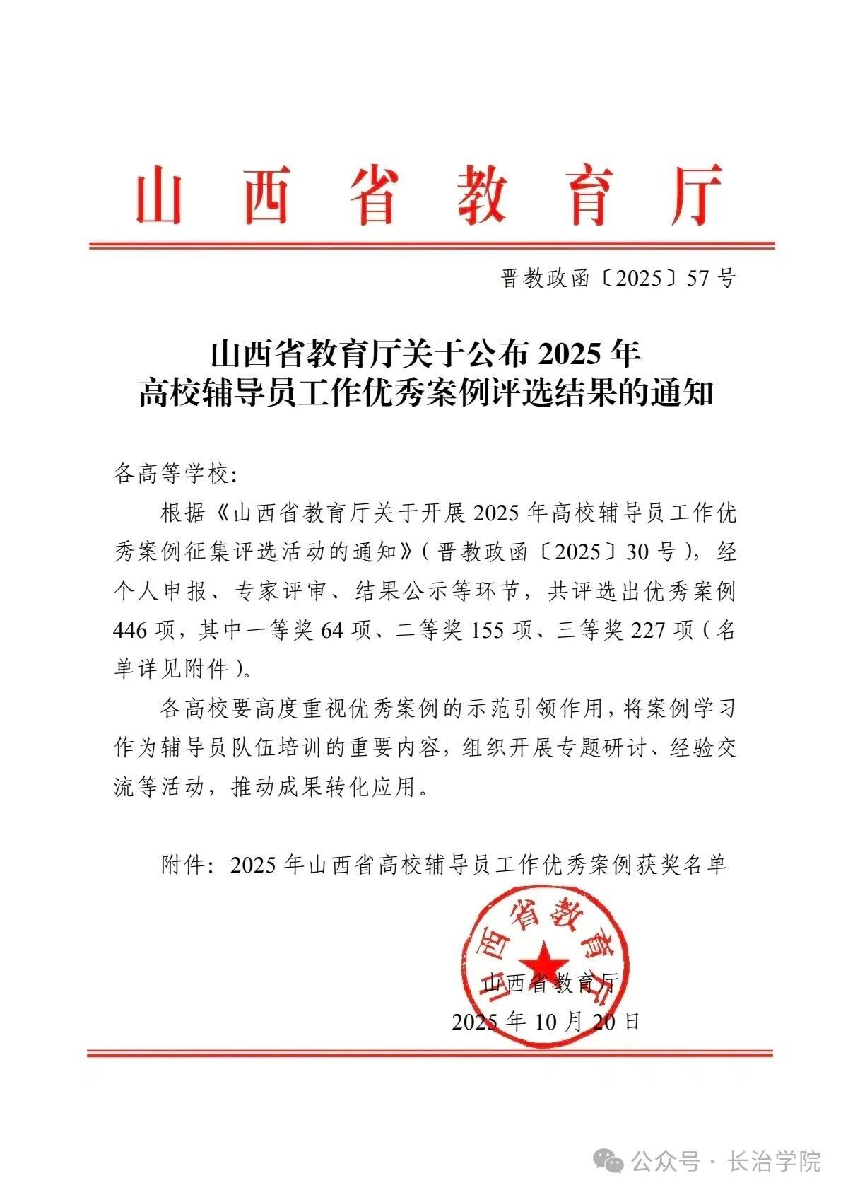 近日,由山西省教育厅组织开展的2025年高校辅导员工作优秀案例征集评选活动获奖名单出炉。beat365辅导员凭借扎实的专业素养和高质量的案例内容在评选中表现突出,喜获佳绩。其中,历史与旅游管理系张泽念,音乐舞蹈系梁越,经济与管理系芦宇婕、李亮提交的工作案例荣获二等奖,经济与管理系白凤麟、马克思主义学院韩贝贝、教育系刘赟荣获三等奖。