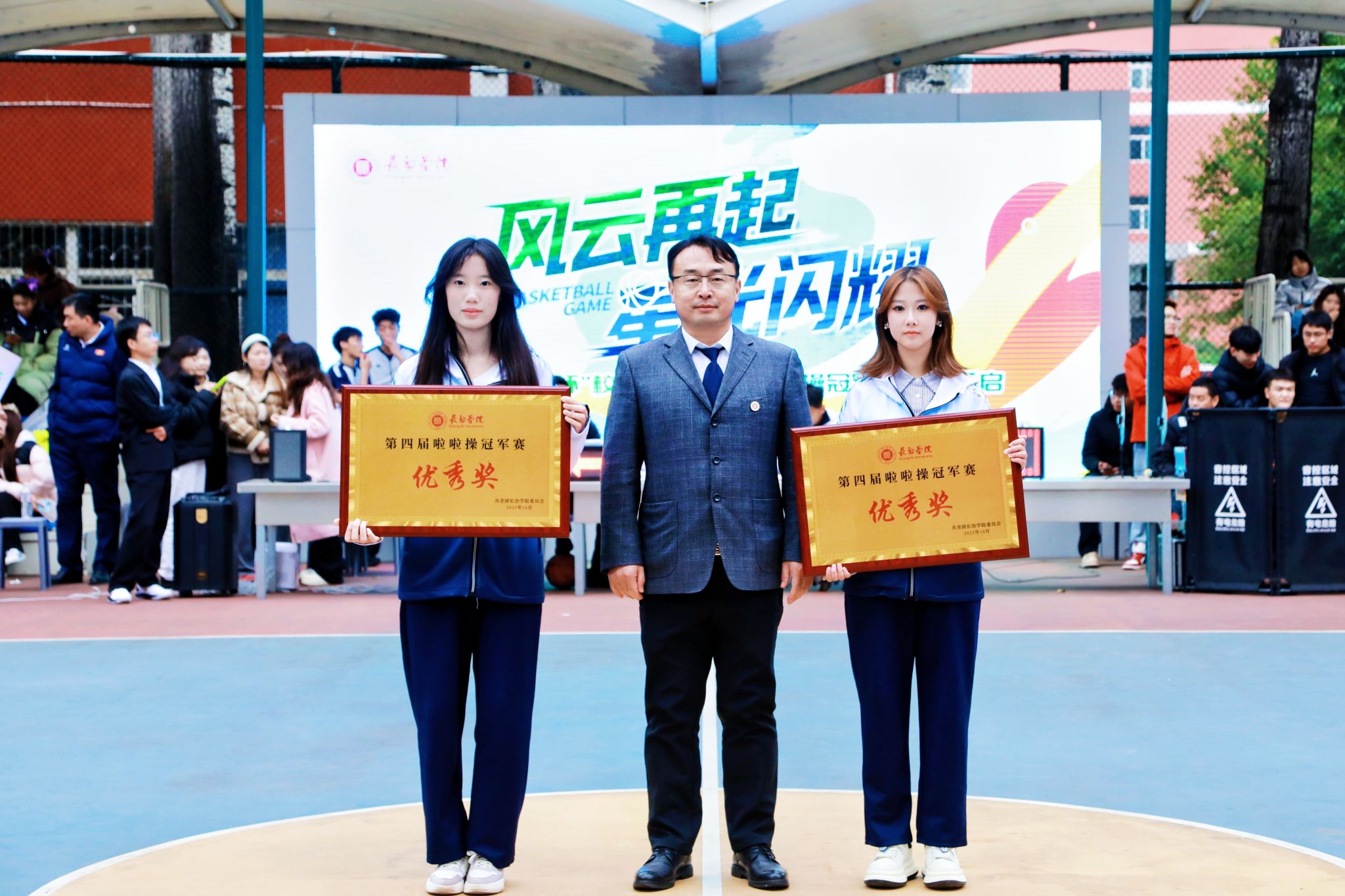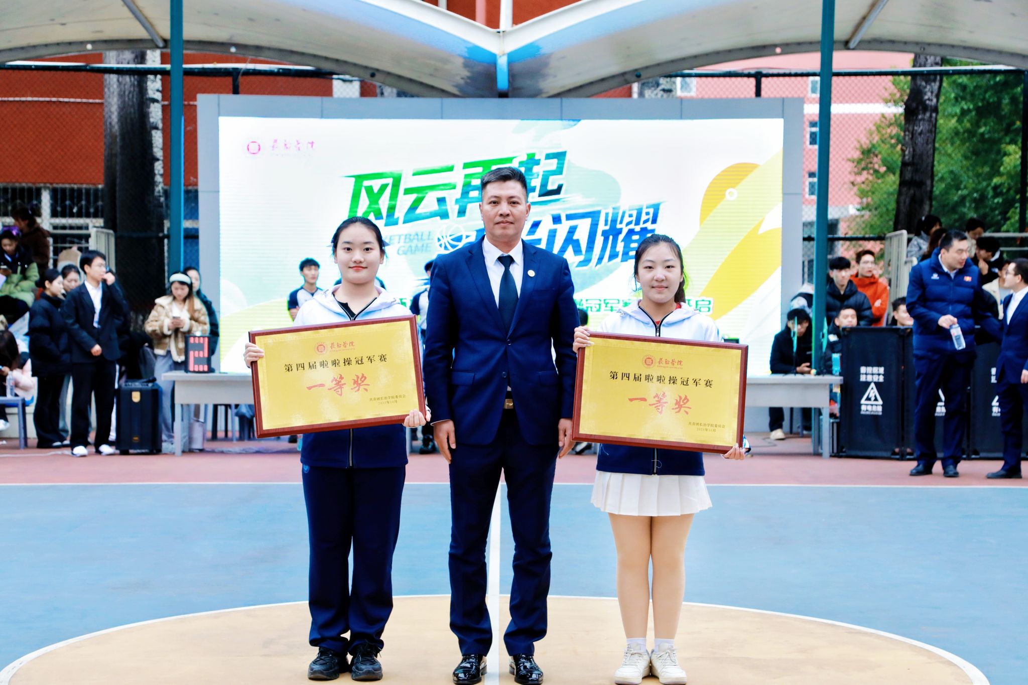 体育系党委书记冯晋军、主任李明为获“最美服饰奖”“最佳创意编排奖”“最佳人气奖”的队伍以及最佳啦啦队长的获得者颁奖