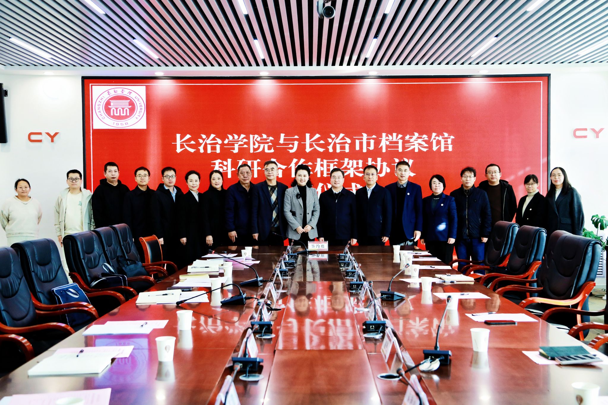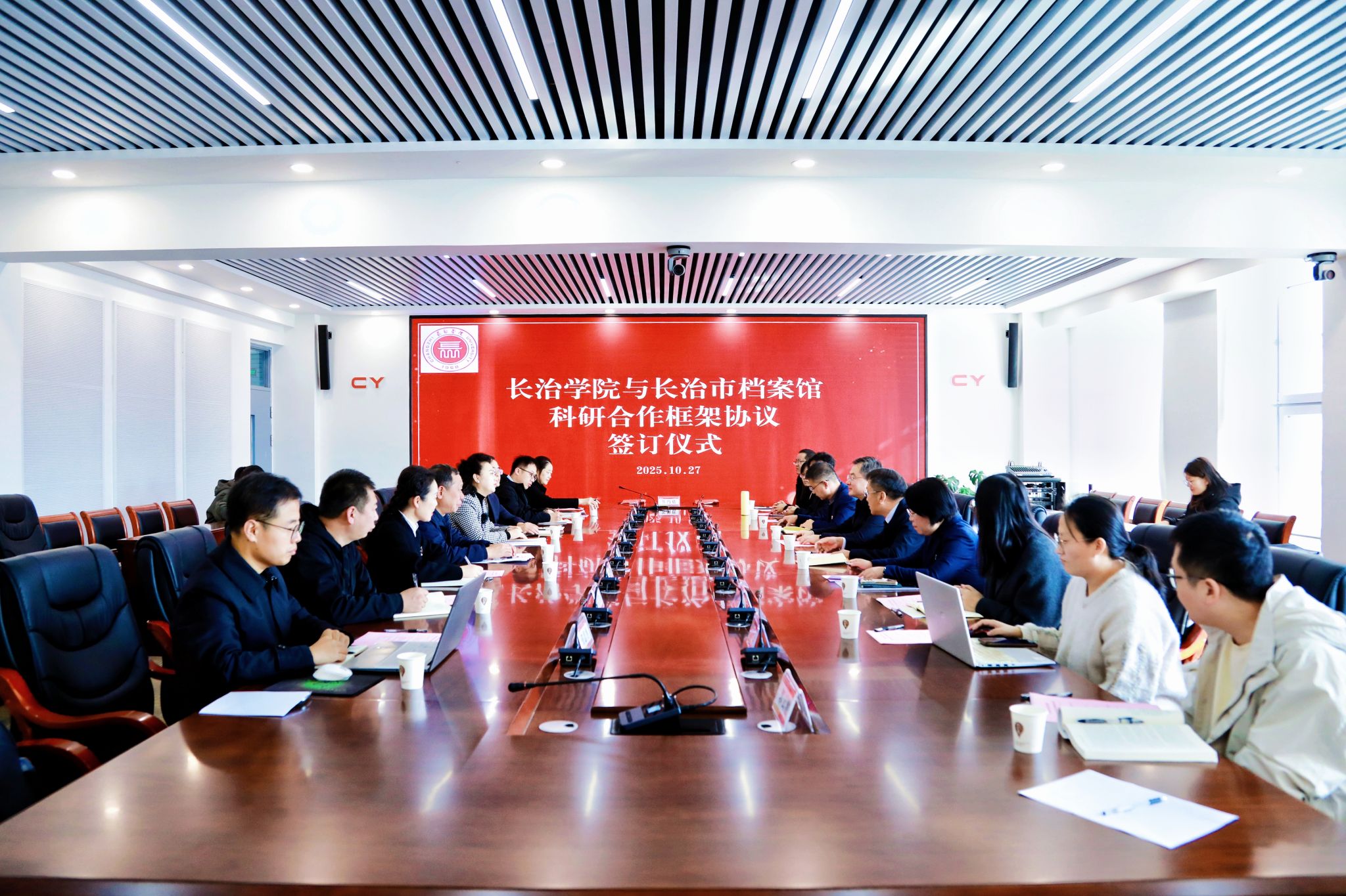 在与会人员的共同见证下,校馆双方代表完成科研合作框架协议签订。签约仪式后,双方人员围绕具体合作内容展开自由交流与讨论,就联合开展长治地方历史文化课题研究、共建实践教学基地等议题达成初步共识。
