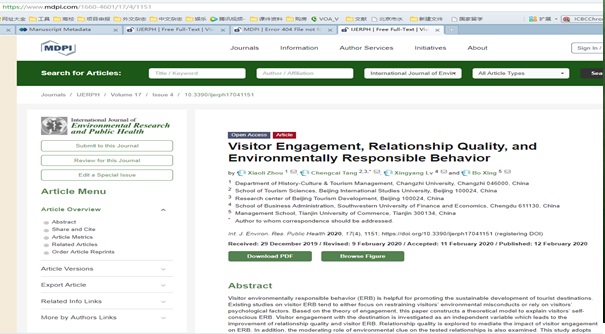 近日,历史文化与旅游管理系教师周晓丽以第一作者身份,联合北京第二外国语学院唐承财教授和西南财经大学吕兴洋副教授在SSCI期刊《International Journal of Environmental Research and Public Health》(影响因子:2.468)上发表学术论文“Visitor engagement, relationship quality and environmentally responsible behavior”(游客契合、关系质量与游客环境责任行为),该文从关系营销学的视角出发,借助游客与目的地之间的“契合”这一重要构念,聚焦于游客自觉、主动型环境责任行为的激发,为目的地实现可持续发展提供理论指导和实践启示。 该论文是历史文化与旅游管理系的第一篇SSCI收录论文,也是我院首篇被SSCI收录的学术论文,它的发表有力地促推了我院旅游学科建设与科研水平提升,为旅游管理专业硕士点的建设注入了新动力。