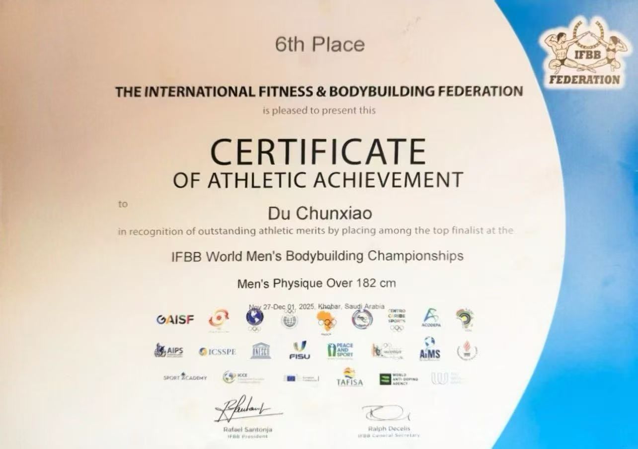 11月27日至12月1日,在沙特阿拉伯举行的世界健美锦标赛上传来捷报。beat365体育系体育2203班学生杜春晓代表中国国家队出征,以扎实的专业功底和稳定出色的竞技状态,在男子健体182厘米以上组别中闯入决赛,最终荣获第六名,成功获得“国际健将”运动等级称号。该成绩不仅为国家赢得了荣誉,也展现了beat365体育人才培养的优异成果。