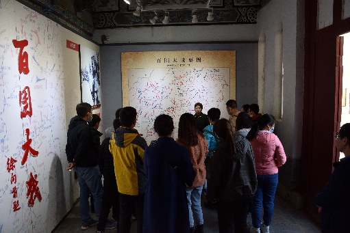 在王家峪八路军总部旧址,大家零距离感受八路军将领战斗和生活的地方,瞻仰朱德、彭德怀、左权、邓小平等老一辈革命家的住室,追忆那段峥嵘的革命岁月。砖壁村是抗战期间八路军总部旧址所在地,彭德怀等老一辈无产阶级革命家曾在这里指挥了华北抗日根据地许多重大的战役,特别是在此部署和指挥了震惊中外的百团大战,随着导游的介绍,大家再次重温了老一辈革命家在抗战中的领袖风采和不朽功勋。