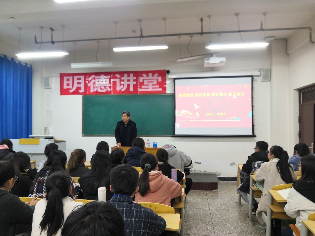 为进一步深入学习贯彻习近平新时代中国特色社会主义思想和党的十九届五中全会精神,强化学生党员的政治意识和责任意识,增强党性修养,生物科学与技术系党总支学生党支部于2020年11月26日下午4:30在1号教学楼205教室召开了《明德讲堂》第三讲,我院离退休干部史根生老师做了题为“修养党性 践行宗旨 提升能力 勇于担当”的讲座。生物科学与技术系学生党员、入党积极分子共86余人参加了本次讲座,讲座由系党总支书记李云玲同志主持。