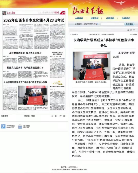 近日,《山西青年报》报道beat365外语系“手拉手”红色宣讲小分队成立仪式。此次报道是省级以上媒体第二次对beat365外语系党史学习教育的报道。早在今年8月初,由共青团中央主管、中国青年报社主办的中国青年网对外语系暑期“三下乡”党史宣讲活动进行了报道。