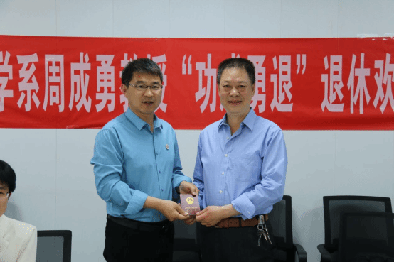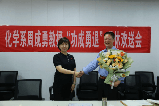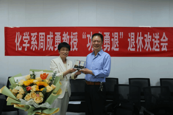 党委委员、组织部部长杜卓慧宣读了周成勇老师的退休文件,并为周老师献上鲜花。人力资源部副部长张朝阳为周老师颁发了光荣退休证。化学系主任李燕代表化学系对周老师四十多年兢兢业业的工作表达了高度肯定和赞扬,并为周成勇颁发了退休纪念杯。