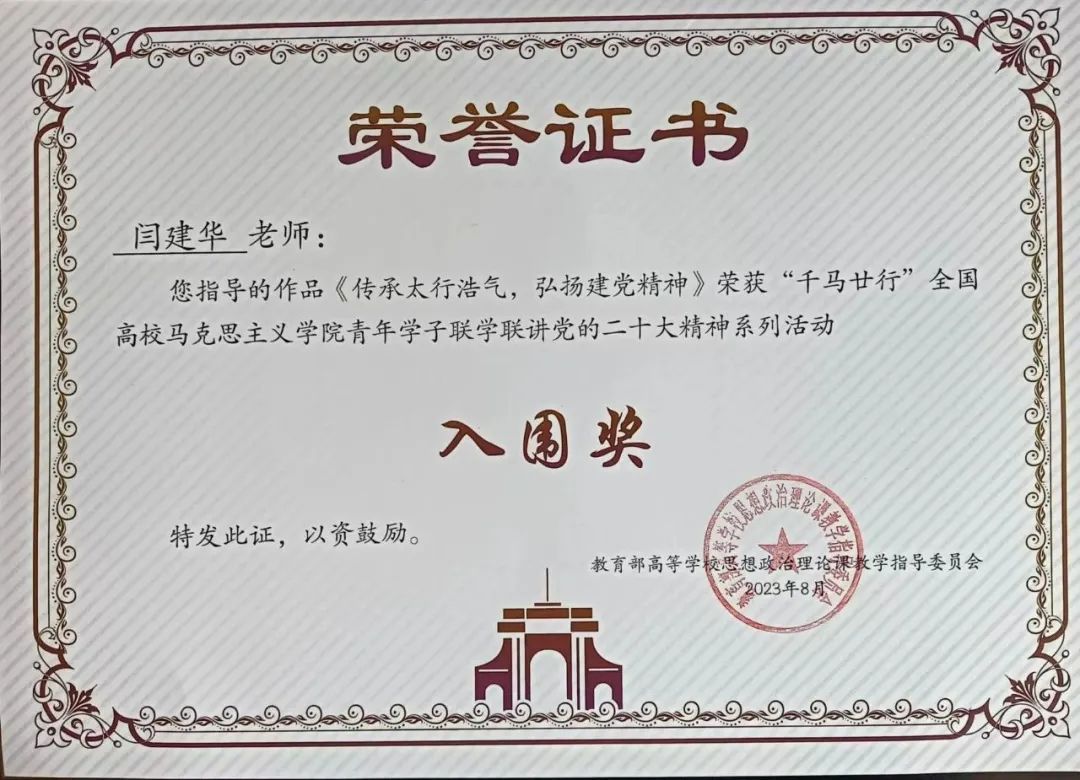 beat365闫建华老师指导的作品《传承太行浩气,弘扬建党精神》荣获“千马廿行”全国高校马克思主义学院青年学子联学联讲党的二十大精神入围奖;思政2101班孟嘉萱同学的作品《传承太行浩气,弘扬建党精神》入围 “千马廿行”全国高校马克思主义学院青年学子联学联讲党的二十大精神系列活动。