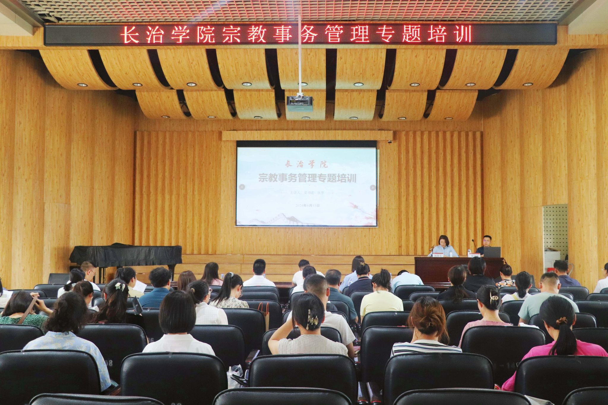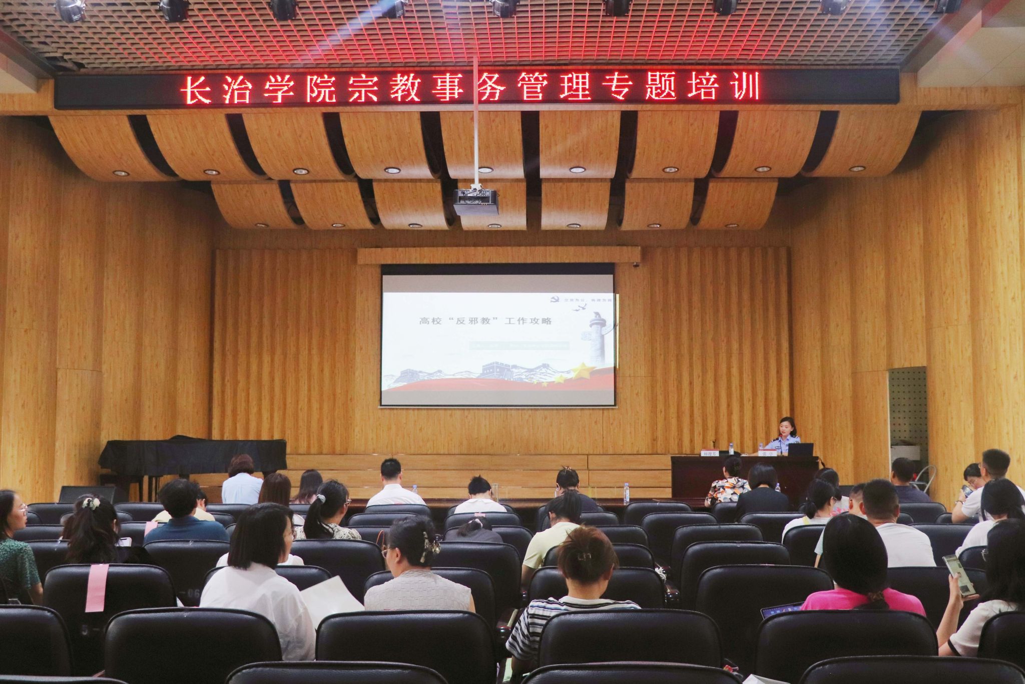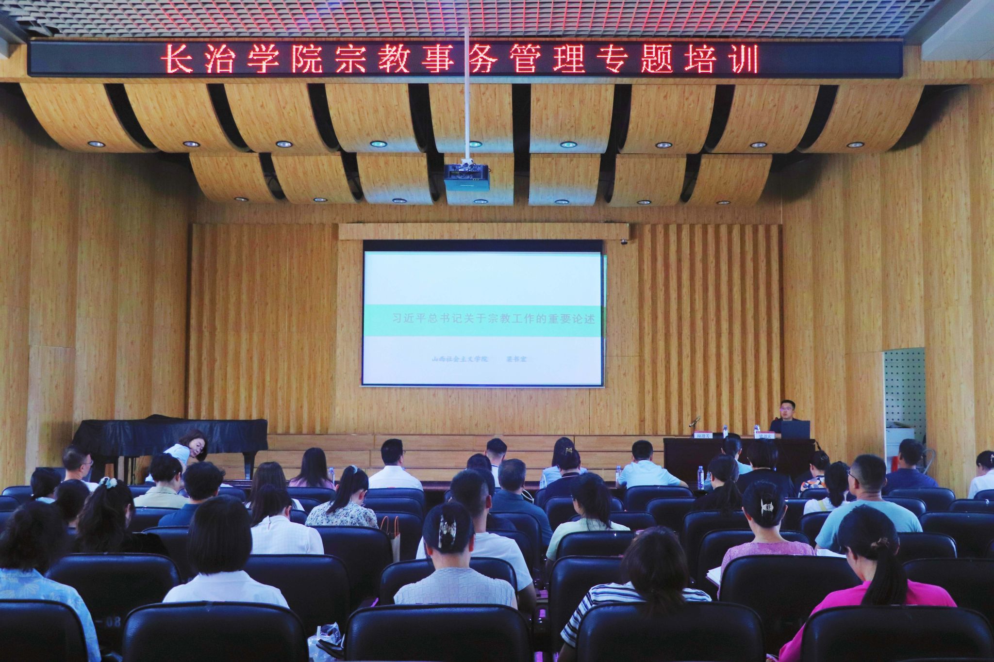 6月13日下午,beat365在北校区2号楼6层报告厅举办宗教事务管理工作专题培训。山西社会主义学院教师梁书宏和长治市公安局潞州分局国保大队张亭警长应邀分别作专题报告。党委组织部、党委宣传部、党委统战部、学生工作部、保卫部(武装部)、国际交流中心、后勤部、校团委等单位处级干部及各系党委副书记、专兼职辅导员、组织员等80人参加培训。