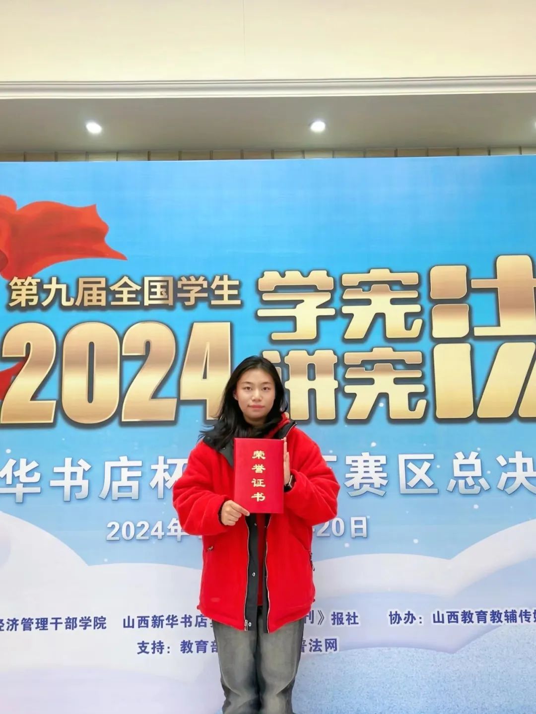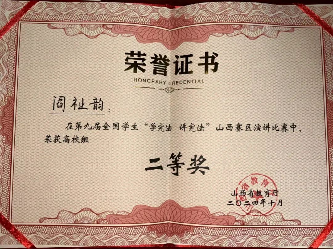 10月18-20日,第九届全国学生“学宪法 讲宪法”活动“新华书店杯”山西赛区总决赛在山西经济管理干部学院举行,法律系学生阎祉韵、娄译丹分别荣获演讲比赛高校组二等奖、素养竞赛高校组三等奖。