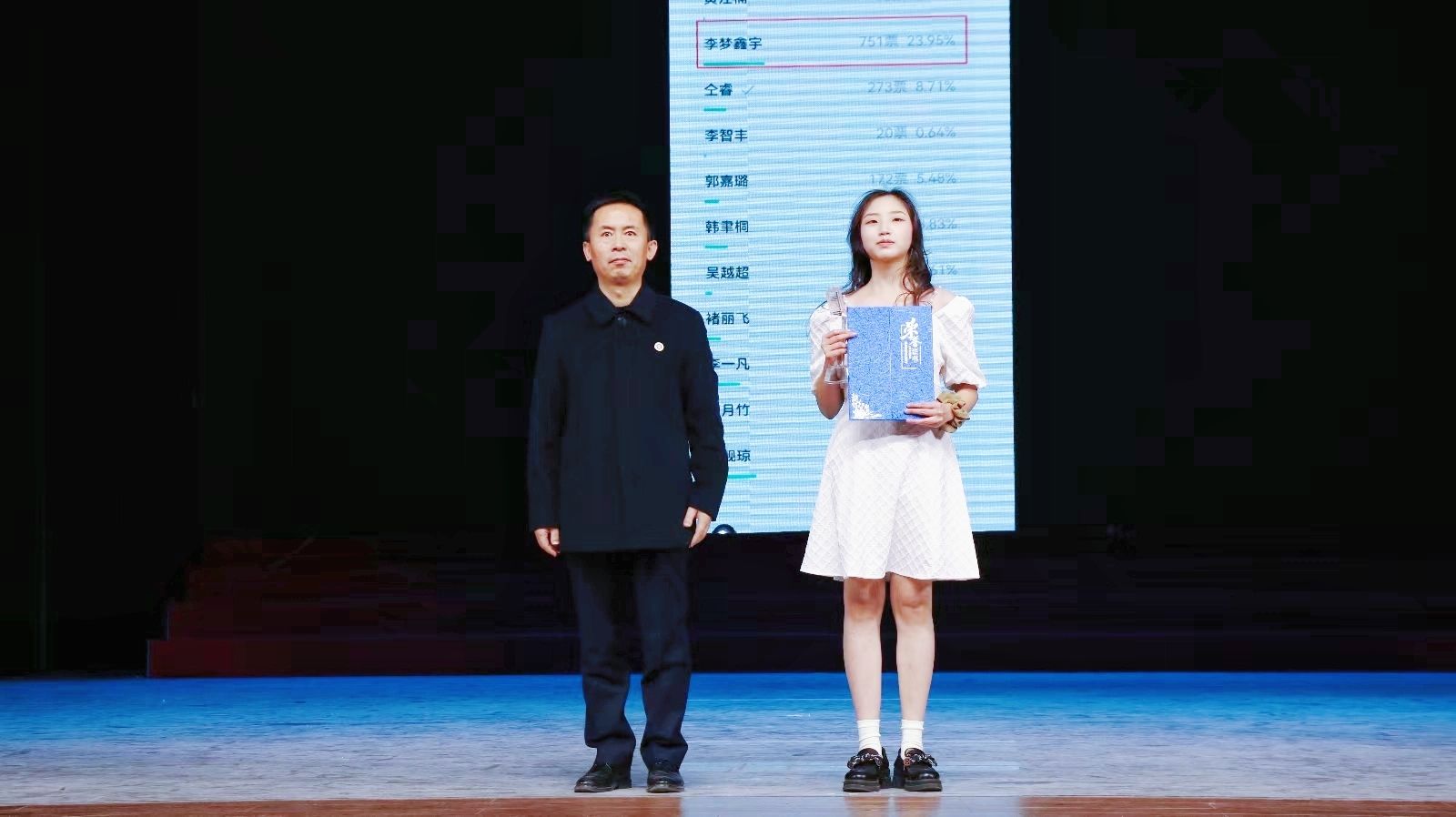 学生工作部部长韩峰为网络人气奖获得者李梦鑫宇颁奖