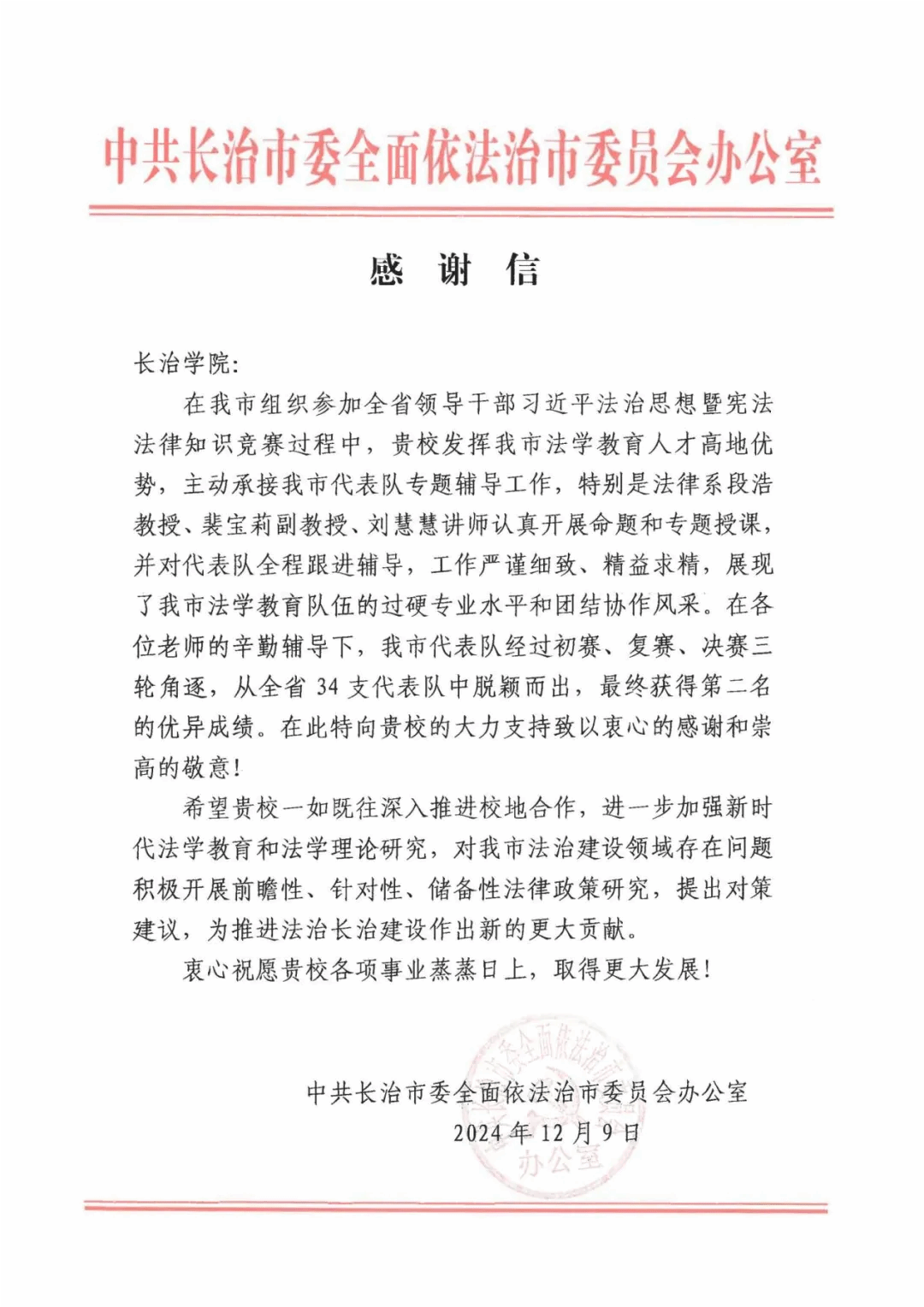近日,beat365收到由中共长治市委全面依法治市委员会办公室发来的感谢信,在信中表达了对beat365法律系段浩、裴宝莉、刘慧慧三位教师在团队备赛过程中命题和授课辅导的感谢,并充分肯定了beat365在推进校地合作、推动法治长治建设方面作出的积极贡献。