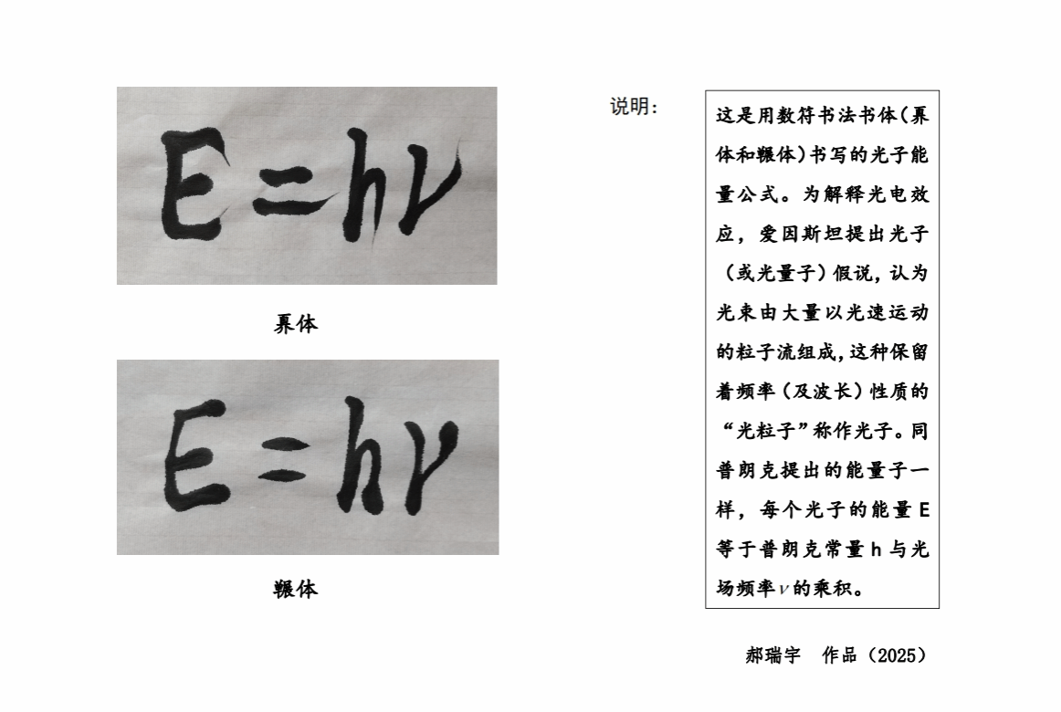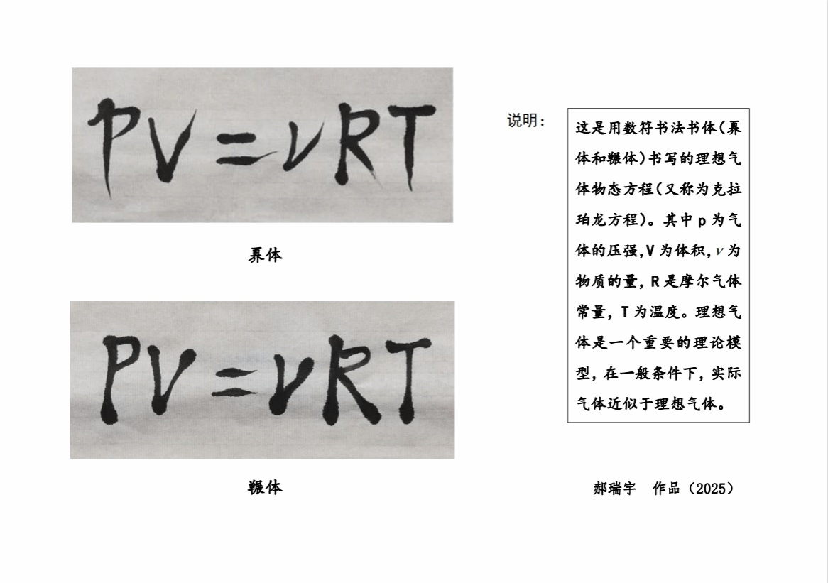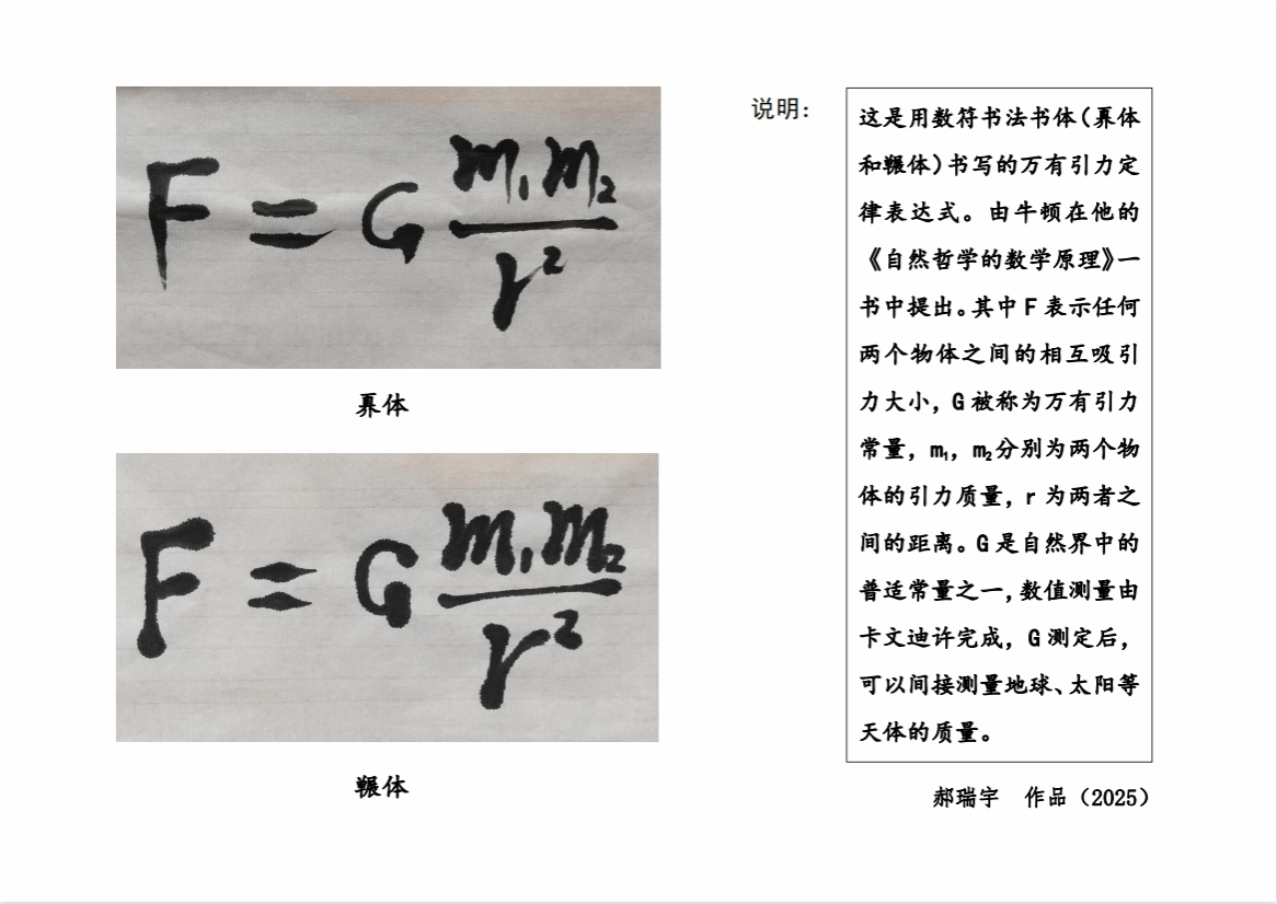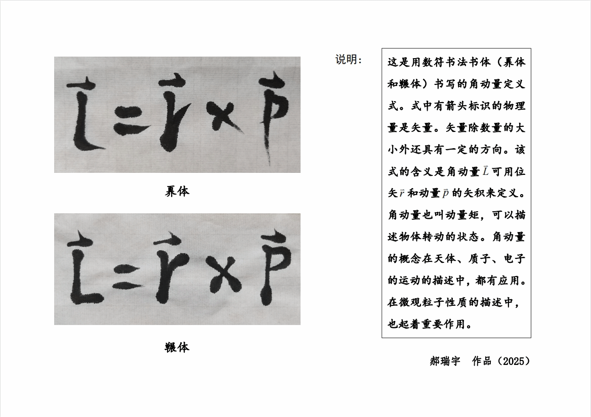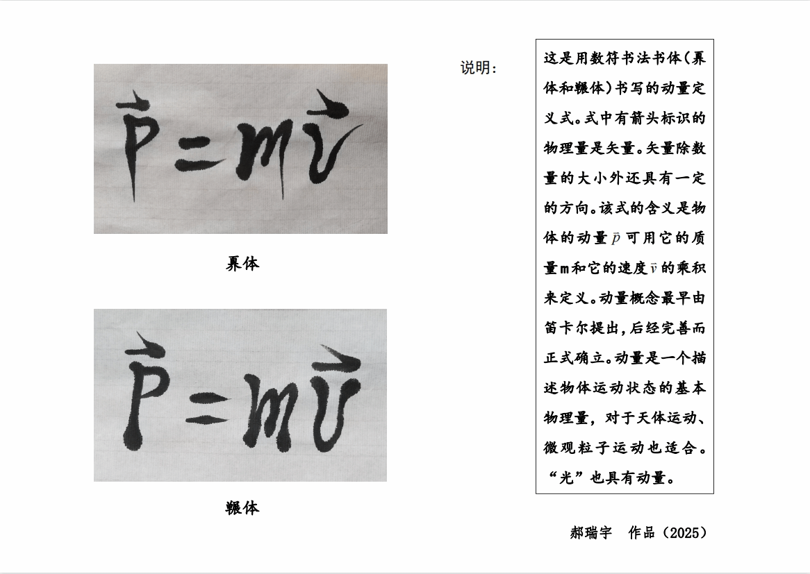 数符书法,以数字、字母、符号等为表现对象,用毛笔呈现科学理论公式,是一种新的科普载体和美育载体,可应用在科学公式科普、文化传播和美育等活动中,有助于人们欣赏特殊线条形态表现的科学公式,感受自然演化韵律,体会科学美和艺术美。近年来,beat365在线唯一官网科普研究所郝瑞宇教授团队,主要以奡体(矫健端肃)和冁体(圆润活泼)呈现动量定义式、角动量定义式、万有引力定律表达式等,在此领域取得原创性成果。