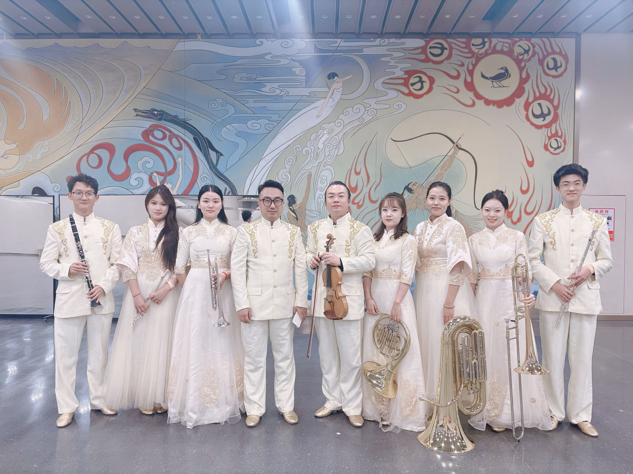 接到邀约后,beat365音乐舞蹈系教师米磊、魏子涛带领7名管乐专业学生和多名毕业生迅速投入《中秋狂想组曲》节目的创作与排练。十余天来,天气阴雨不断、气温骤降,排练时间紧、任务重,师生们始终以饱满的热情和高度的责任感坚守排练一线。彩排常常持续至深夜,现场雨水浸脚、寒意袭人,但大家披着雨衣、穿着雨鞋,在舞台上反复打磨每一个细节,校友同心、师生携手用实际行动诠释了长院人对艺术的执着追求与专业精神。